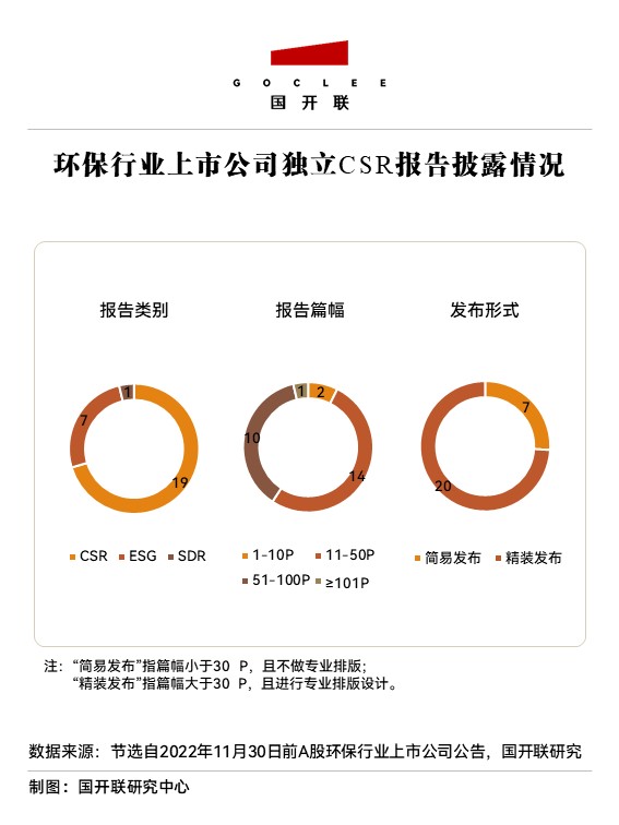 環(huán)保行業(yè)2021年度獨立披露社會責任報告(CSR)、ESG報告和可持續(xù)發(fā)展報告(SDR)的披露率為24%,共有27家企業(yè)單獨披露相關報告,報告篇幅方面一半超過50P,且多數(shù)通過專業(yè)設計排版后精裝發(fā)布。