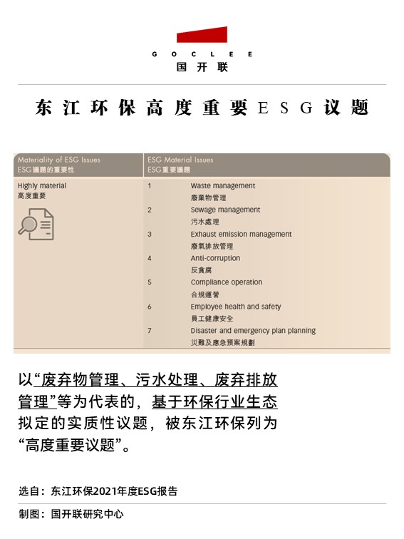 從東江環(huán)保2021年度ESG報告中擬定的實質(zhì)性議題來看,東江環(huán)保將“廢棄物管理、污水處理、廢棄排放管理”等基于環(huán)保行業(yè)生態(tài)導向性議題,列為了“高度重要議題”。