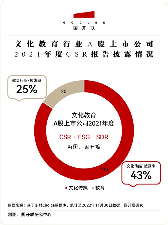 國開聯(lián)《報(bào)告》數(shù)據(jù)顯示,截至2022年11月30日,我國A股市場(chǎng)共有文化傳媒行業(yè)上市公司110家,教育行業(yè)上市公司20家。其中,2021年度有獨(dú)立披露社會(huì)責(zé)任報(bào)告(或ESG報(bào)告、可持續(xù)發(fā)展報(bào)告)的文化傳媒類企業(yè)47家,教育類企業(yè)5家。