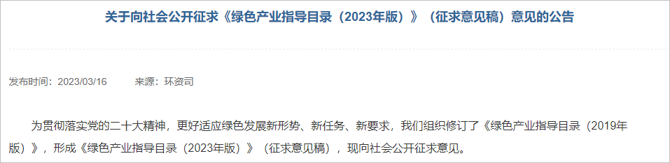 日前,國家發(fā)改委發(fā)布“關(guān)于向社會公開征求《綠色產(chǎn)業(yè)指導(dǎo)目錄(2023年版)》(征求意見稿)意見的公告”,《綠色產(chǎn)業(yè)指導(dǎo)目錄(2023年版)》(征求意見稿)(以下簡稱《目錄2023》)隆重面世。