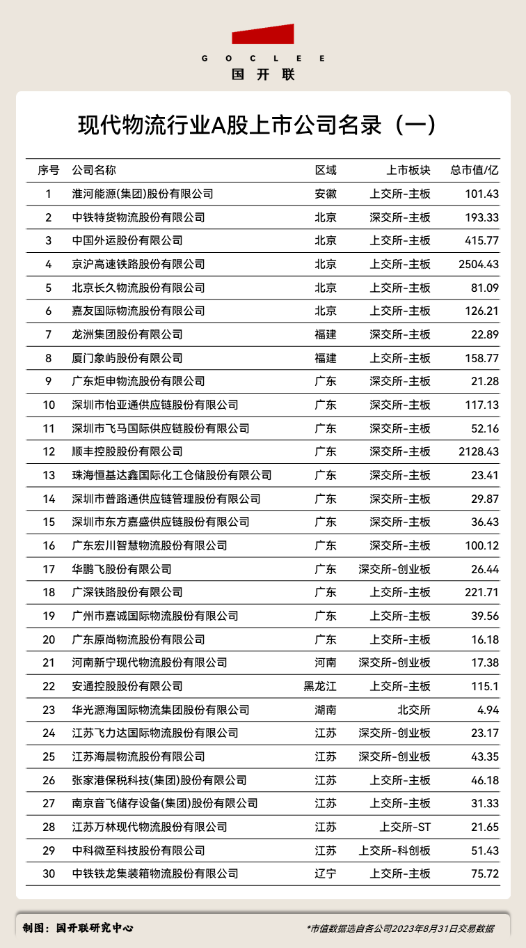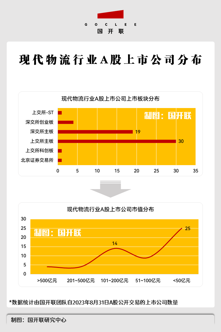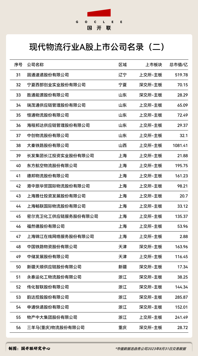 根據(jù)國開聯(lián)研究中心的統(tǒng)計數(shù)據(jù),截至2023年8月31日,我國A股現(xiàn)代物流業(yè)上市公司,共計56家,廣泛分布于上交所、深交所和北交所。